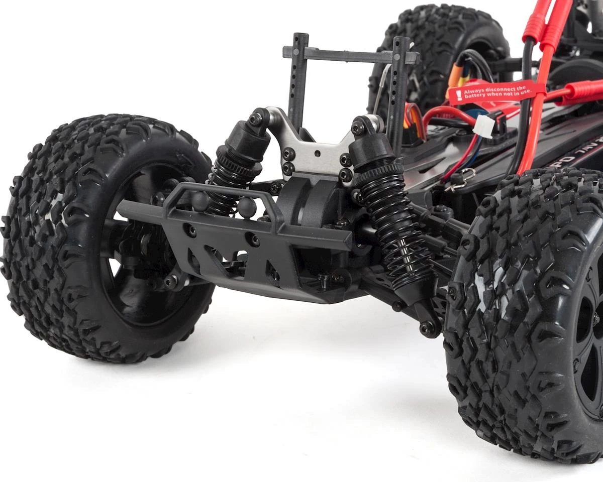 Lightweight plastic chassis, four oil filled adjustable coil over shocks, and independent suspension offer rock solid performance as the soft compound monster truck tires leave disaster in their wave. Fear not! A 2.4GHz radio system and waterproof electronics ensure control, for those who dare to unleash the power of the Blackout!