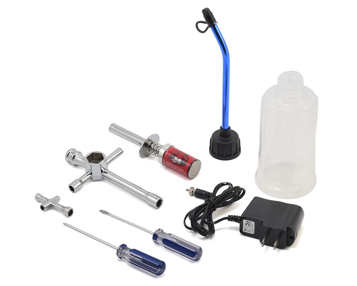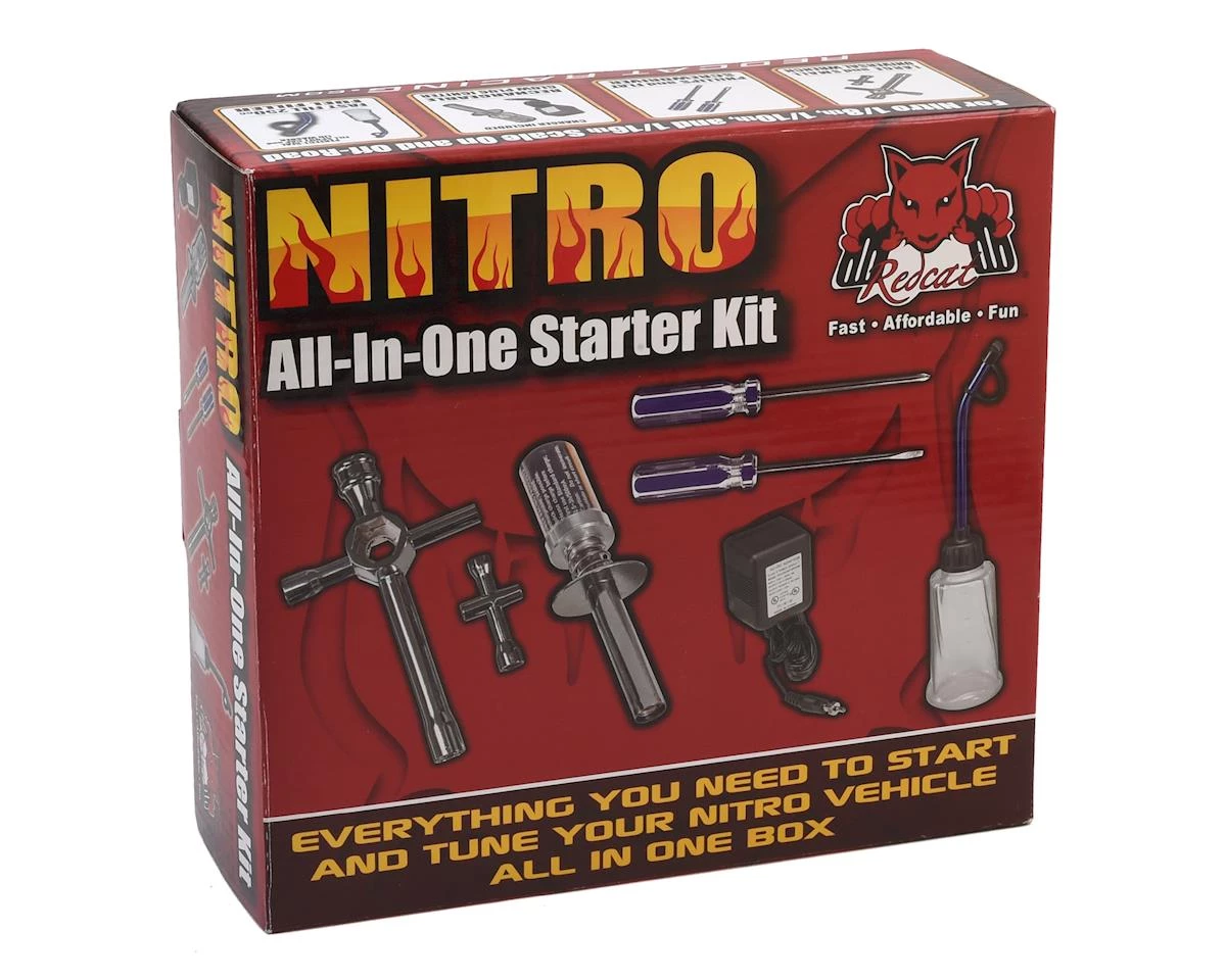 This is the Redcat Nitro All-In-One Starter Kit. This kit is great for 1/8, 1/10 and 1/16 scale on-road and off-road vehicles, and includes a large and small universal wrench, phillips and flat screwdrivers, a rechargeable glow plug ignitor and a fast fill 250cc fuel filler.
